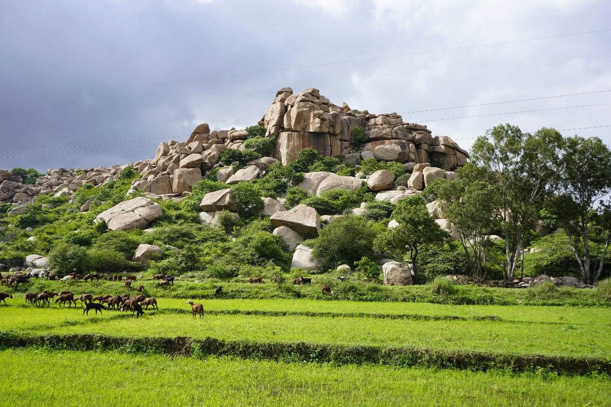 Rocky terrain, lush greenery, and the Tungabhadra River.